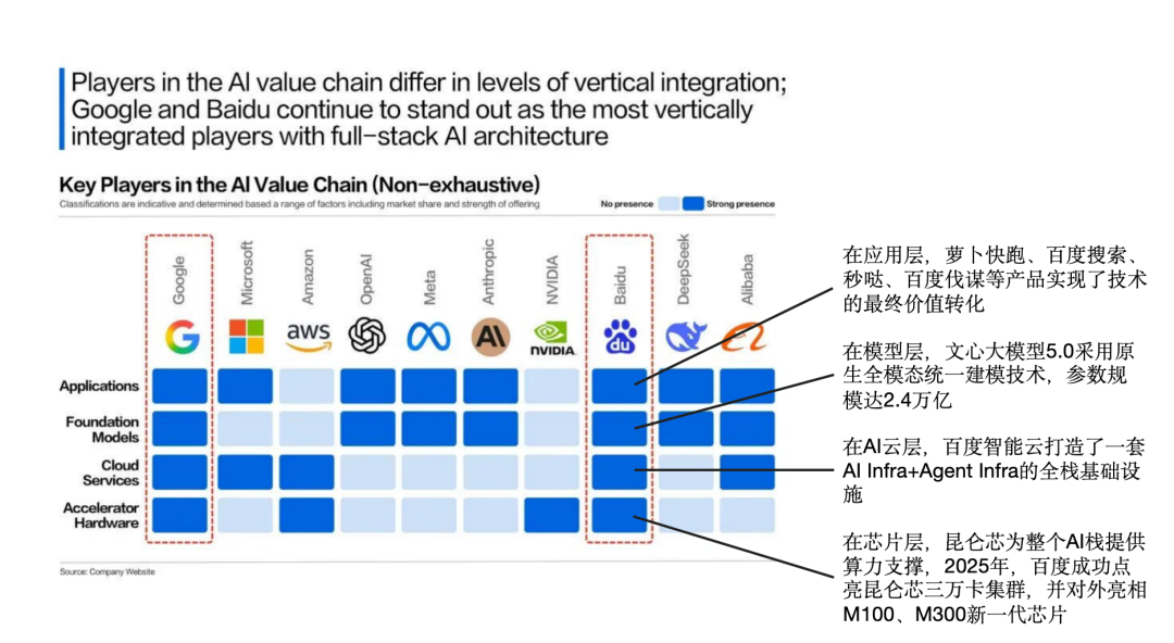 在人工智能领域,百度是全球为数不多在AI四层技术栈(芯片层、AI云层、模型层、应用层)都有全面布局的企业。