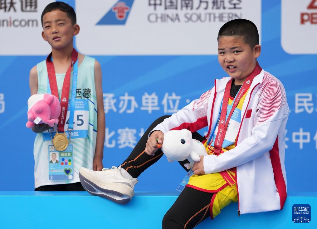 12月10日,获得季军的湖北队选手桂文杰(右)和获得冠军的西藏队选手欧珠次仁在男子8-11岁组垒球颁奖仪式上。新华社记者 杨晨光 摄